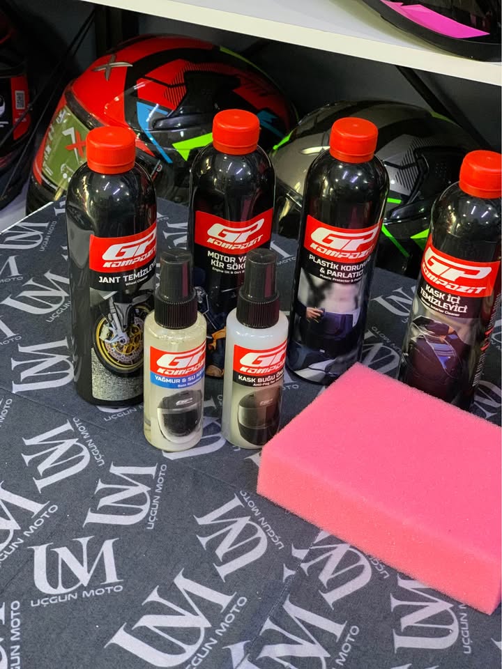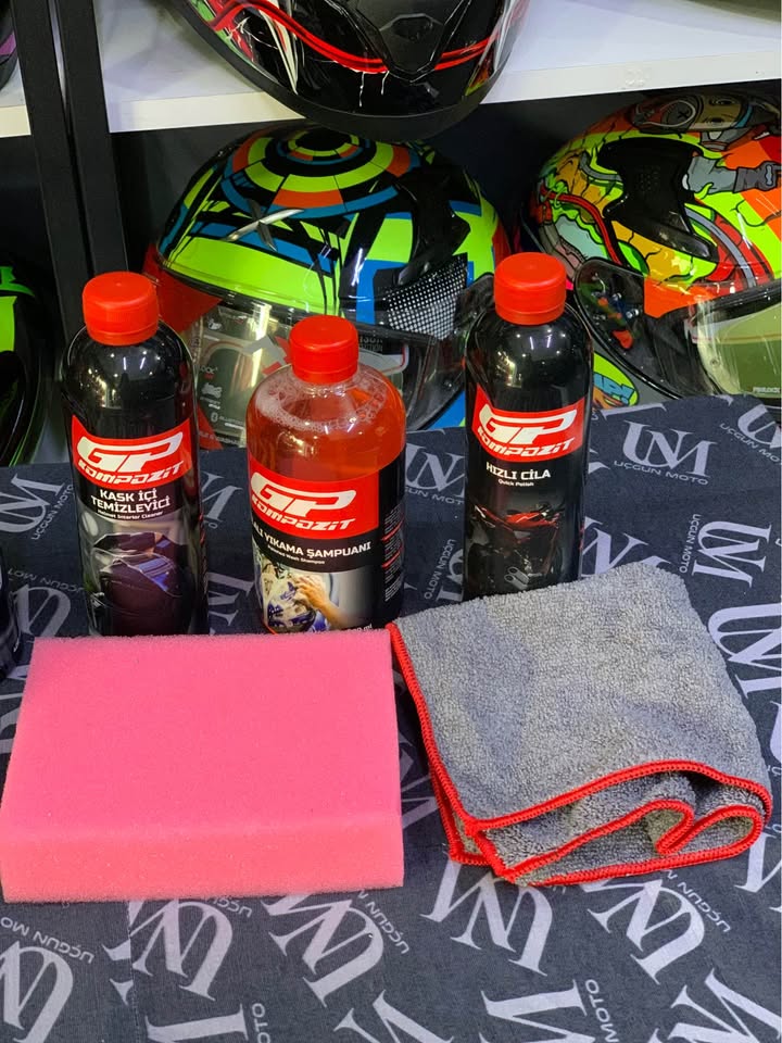 GP KOMPOZİT TEMİZLEME SETİ İÇİNDEKİLER 1- MİKROFİBER BEZ 2- UYGULAMA SÜNGERİ 3- YIKAMA KOVASI (10 LİTRE) 4- MOTOSİKLET HIZLI CİLA SPREY 400 ML 5- MOTOR YAĞI VE KİR SÖKÜCÜ SPREY 400 ML 6- CİLALI MOTOSİKLET ŞAMPUANI 500 ML 7- YAĞMUR KAYDIRICI SPREY 100 ML 8- KASK BUĞU ÖNLEYİCİ SPREY 100 ML 9- PLASTİK KORUYUCU VE PARLATICI SPREY 400 ML 10- JANT TEMİZLEYİCİ SPREY 400 ML 11- KASK İÇİ TEMİZLEYİCİ (BAKTERİ ÖNLEYİCİ) FRESH SPREY 400 ML